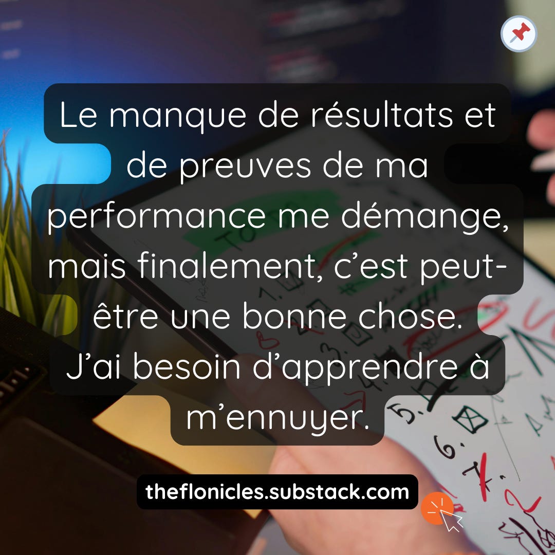 Ça me démange. Mais finalement, c’est peut-être une bonne chose. Après une trentaine d’années à poursuivre les accomplissements, le dépassement de moi, le dépassement des autres même quand ils ont 10 ans d’expérience en plus que moi, la perfection, j’ai peut-être besoin d’accepter cette période où je m’ennuie régulièrement.