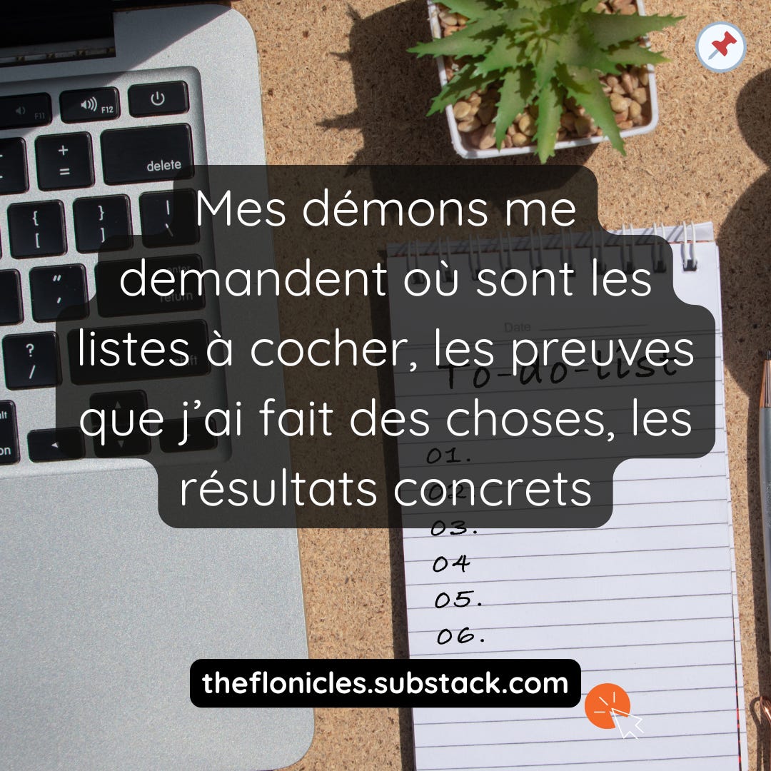 Mais voilà, je m’ennuie souvent. J’ai commencé à sentir que ça me démangeait aux encolures, et j’ai réalisé que, ce moment où j’avais besoin d’une pause sèche a fait son temps, et mes démons me demandent où sont les listes à cocher, les preuves que j’ai fait des choses, les résultats concrets.