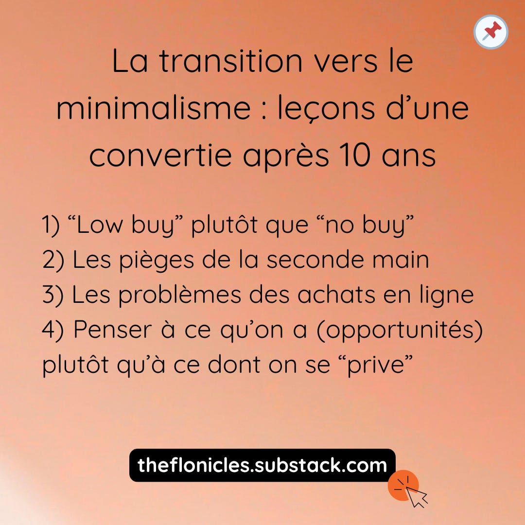 Cela fait plus de dix ans que j’ai entamé une démarche “minimaliste”, qui se traduit concrètement par : un temps d’arrêt avant d’acheter quelque chose, une réflexion sur l’équilibre entre qualité et budget, une tentative d’acheter de seconde main autant que possible, la possession de ce qui est nécessaire, et la limitation des achats globalement.