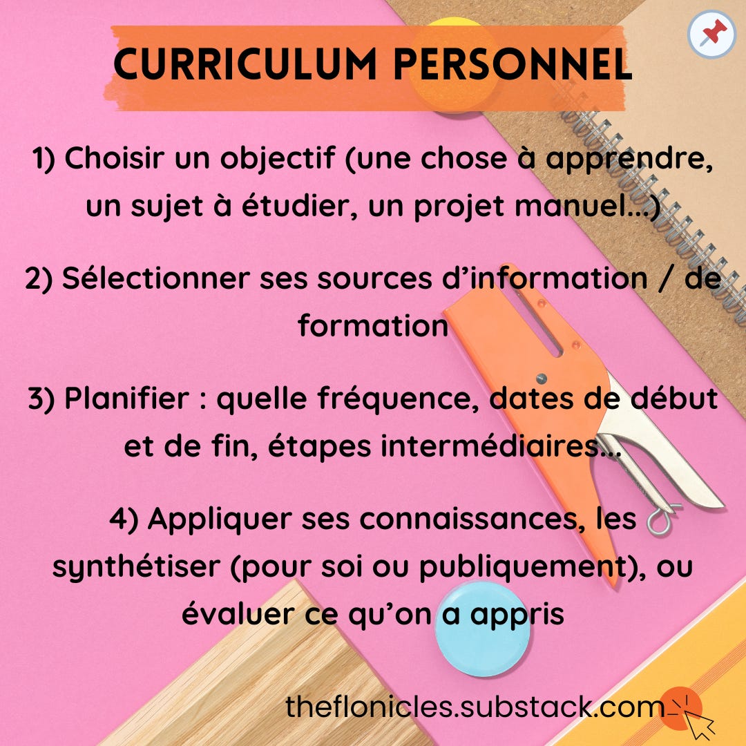 Les points clés d’un curriculum personnel : 1) choisir un objectif 2) sélectionner des ressources 3) planifier (fréquence, début-fin) 4) appliquer, synthétiser ou évaluer*